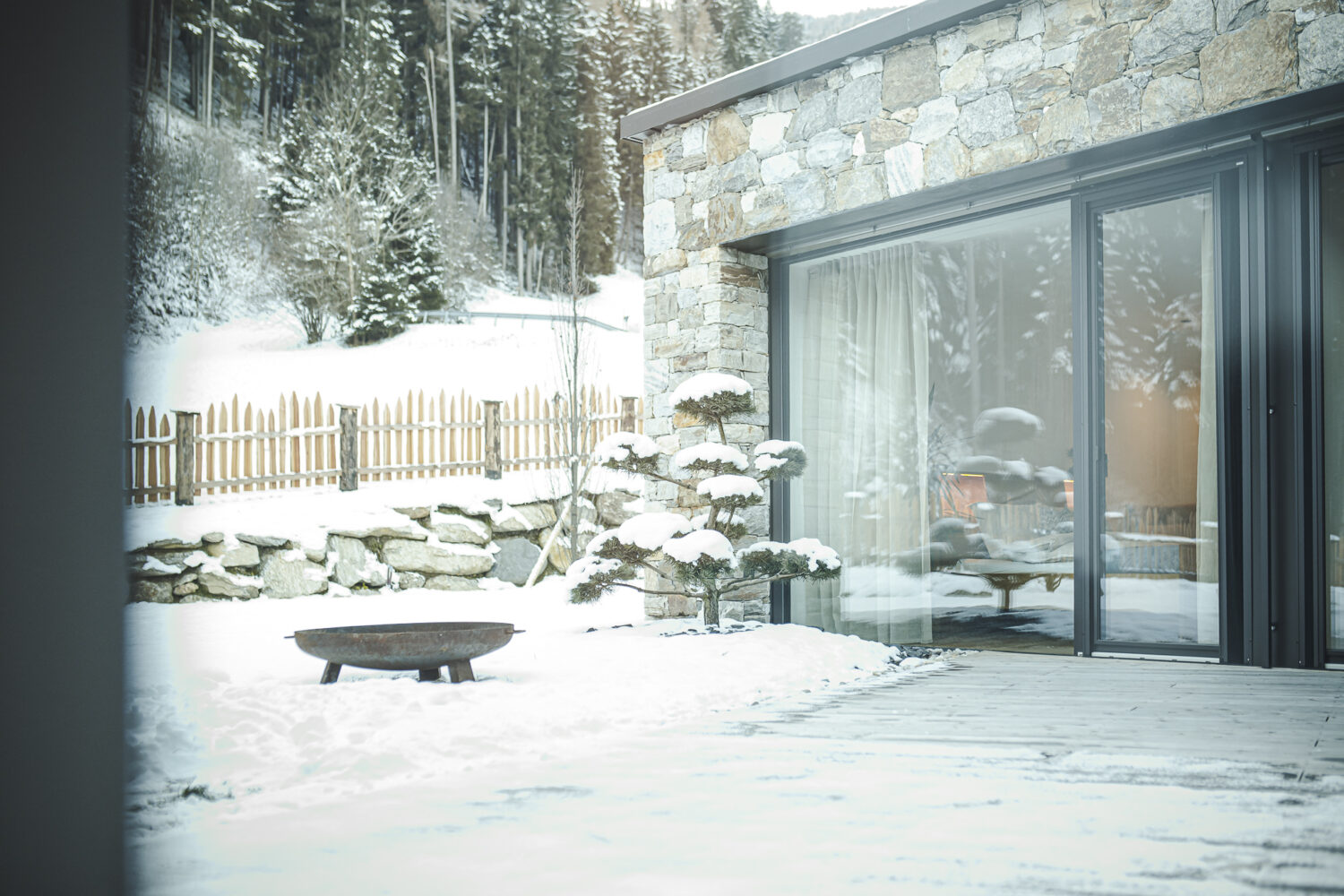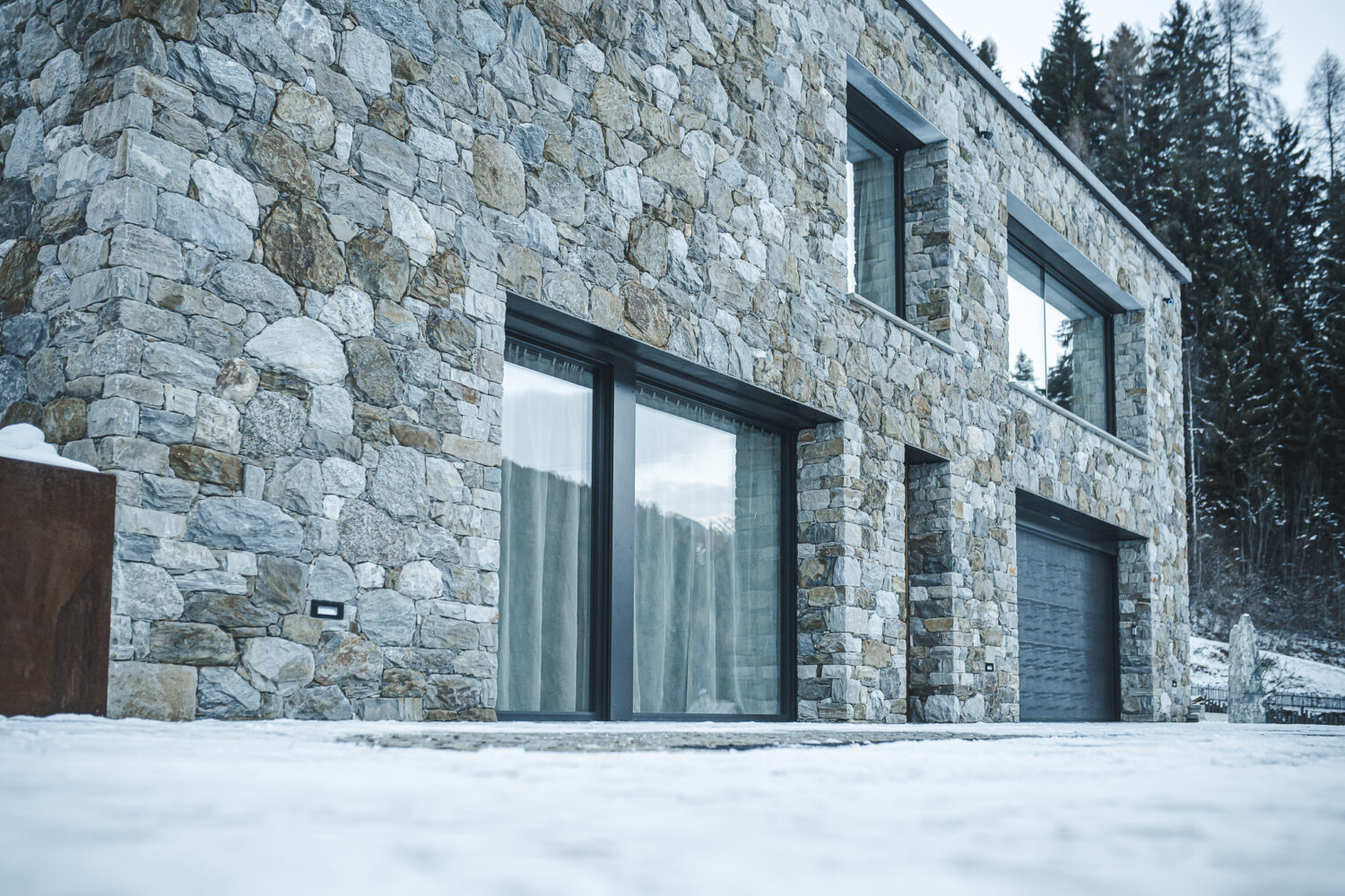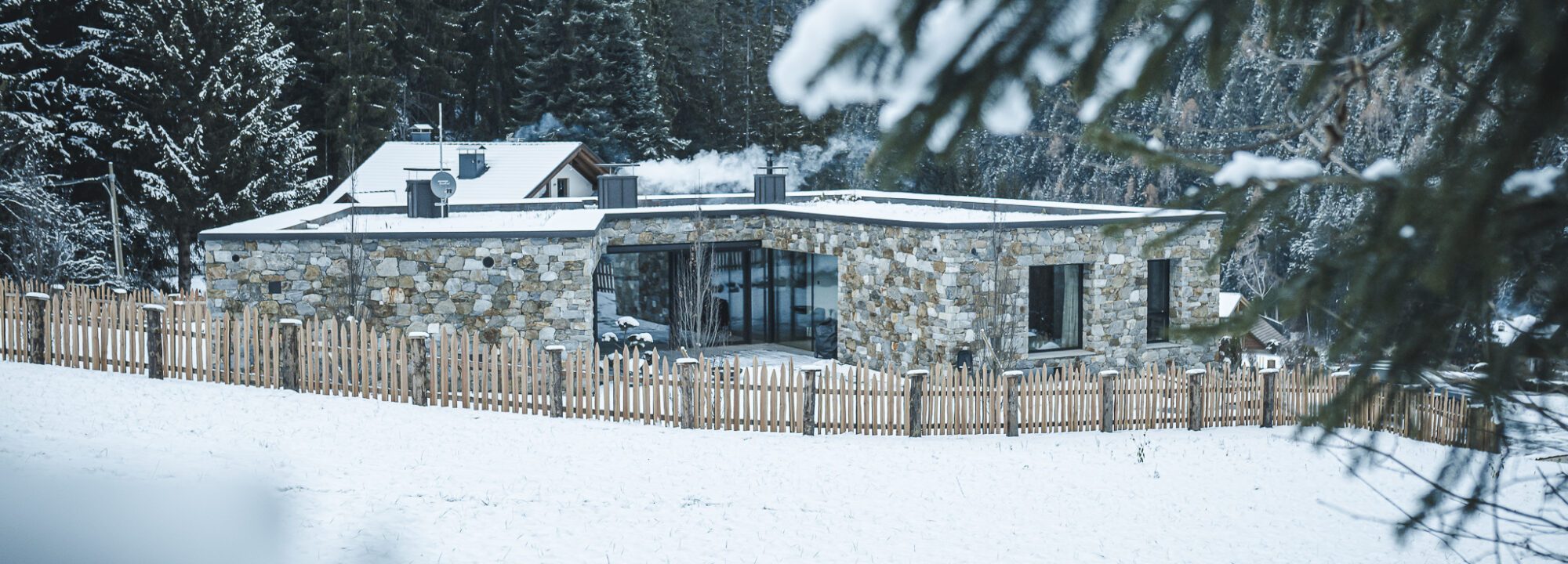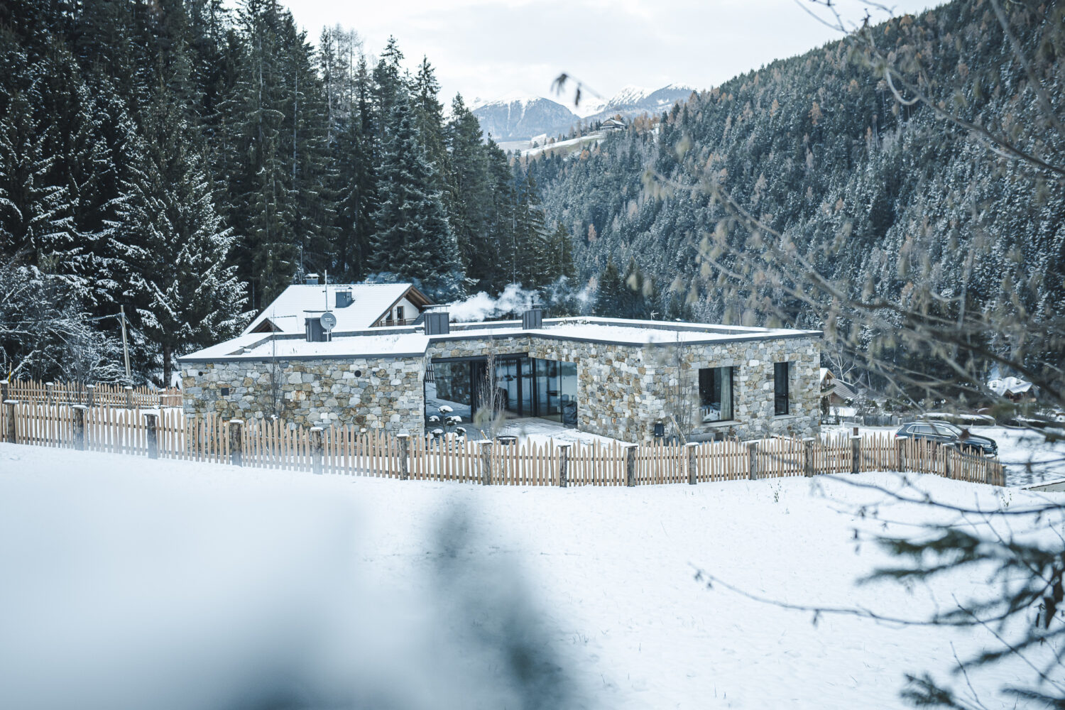 Vom Lauf der Zeit gezeichnet, erzählt charaktervolles Altholz leise Geschichten und verleiht dem Ort eine warme, geborgene Seele. Naturstein, kraftvoll und zeitlos, formt die C-förmige Architektur und lässt die Fassade in stiller Harmonie mit der umgebenden Landschaft verschmelzen.