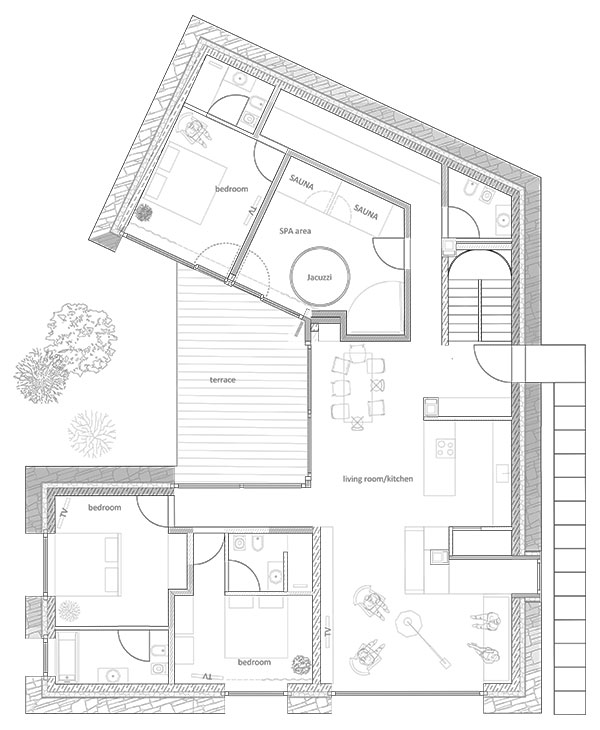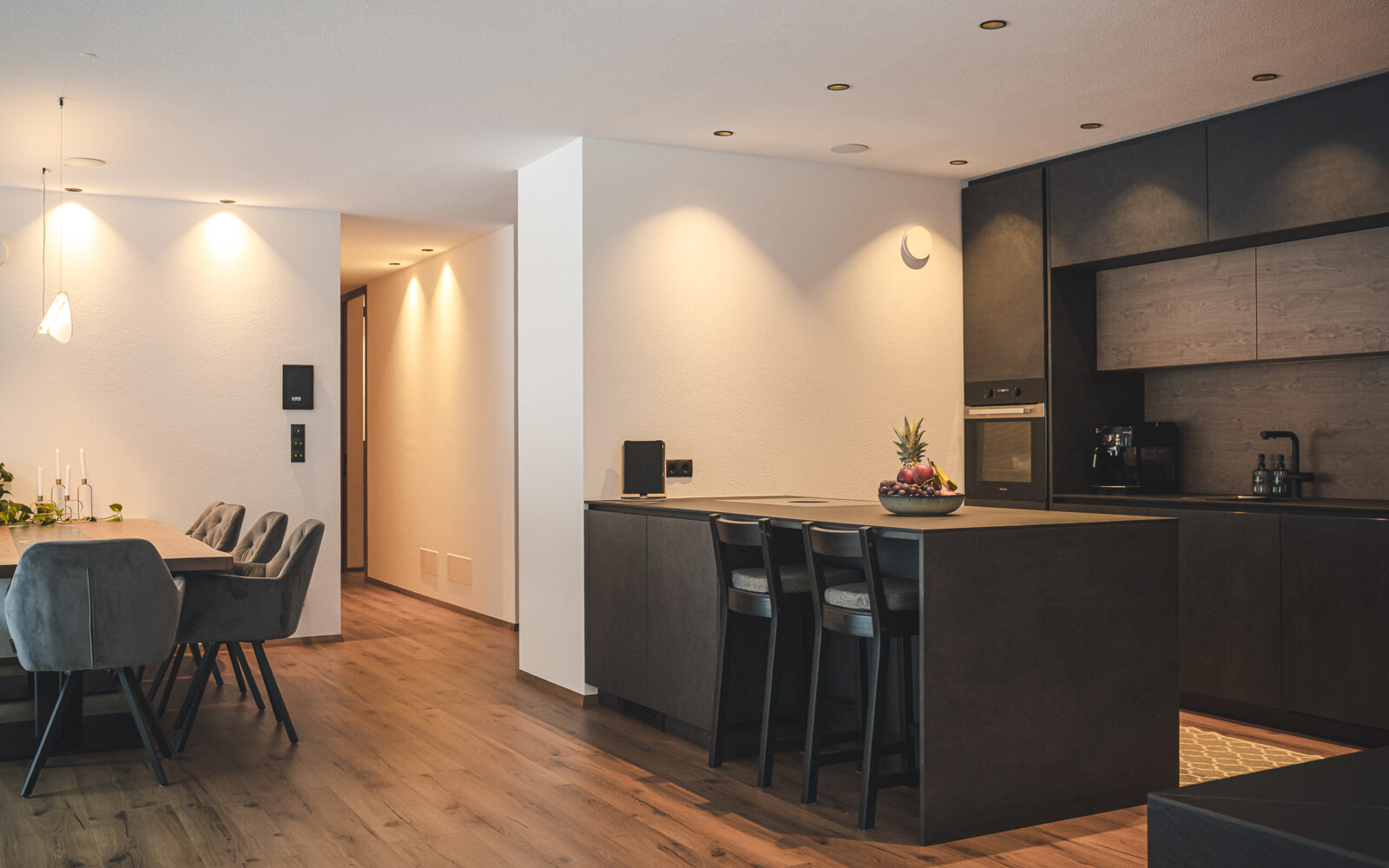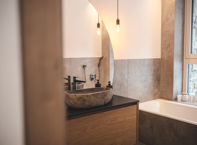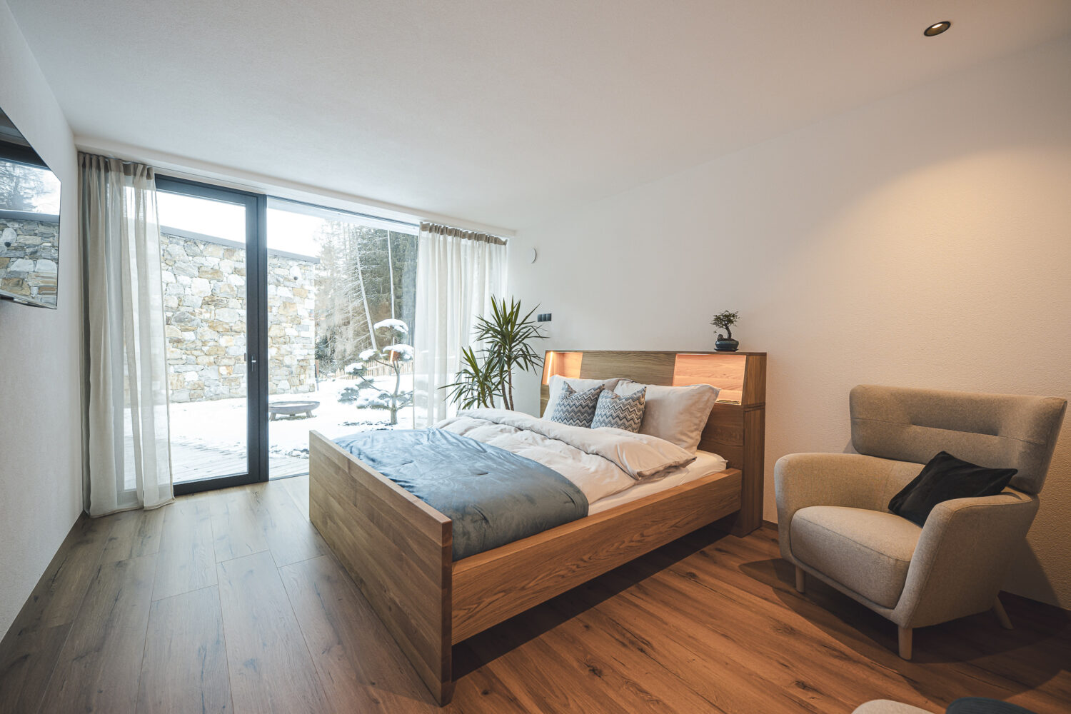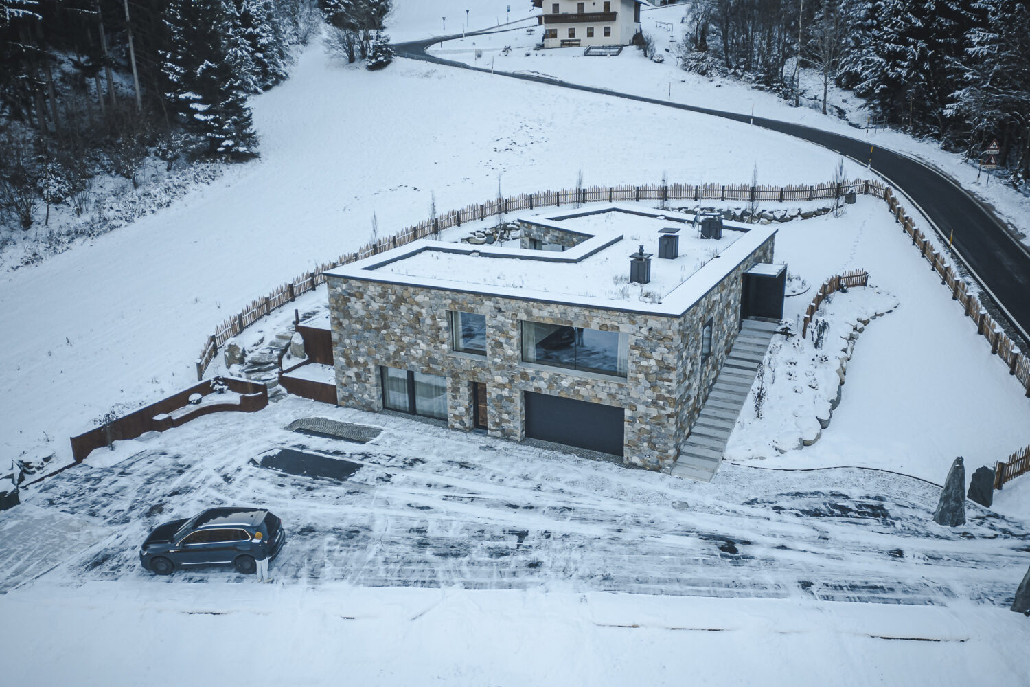 Vom Lauf der Zeit gezeichnet, erzählt charaktervolles Altholz leise Geschichten und verleiht dem Ort eine warme, geborgene Seele. Naturstein, kraftvoll und zeitlos, formt die C-förmige Architektur und lässt die Fassade in stiller Harmonie mit der umgebenden Landschaft verschmelzen.